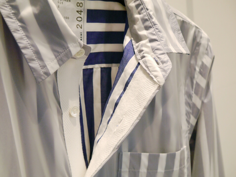 ストライプシャツの上から半透明のPVCを被せたデザインの、sacaiのコレクションらしさ溢れる一着。