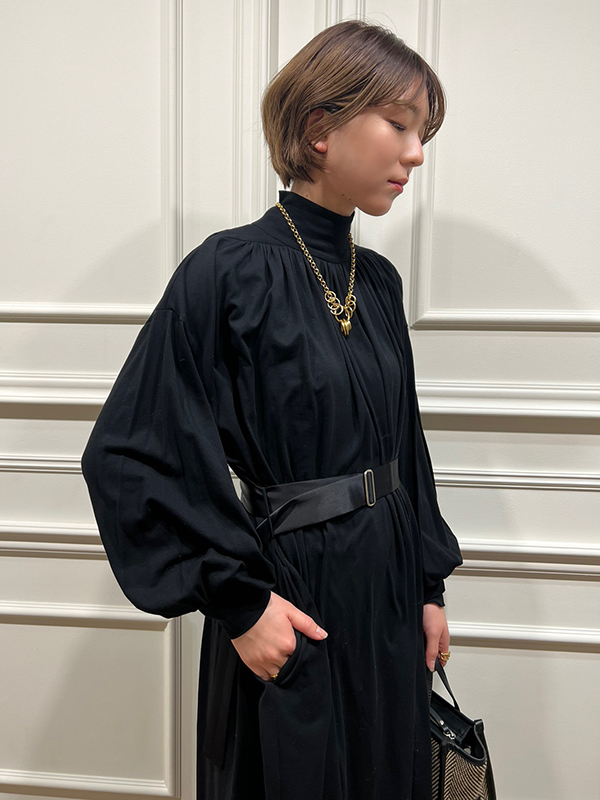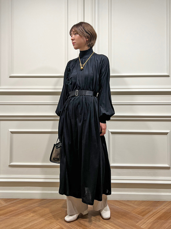 たっぷりと使った生地とギャザーが美しいシルエットのドレスで、ワイドパンツを合わせることでよりモードにお召し頂けます!