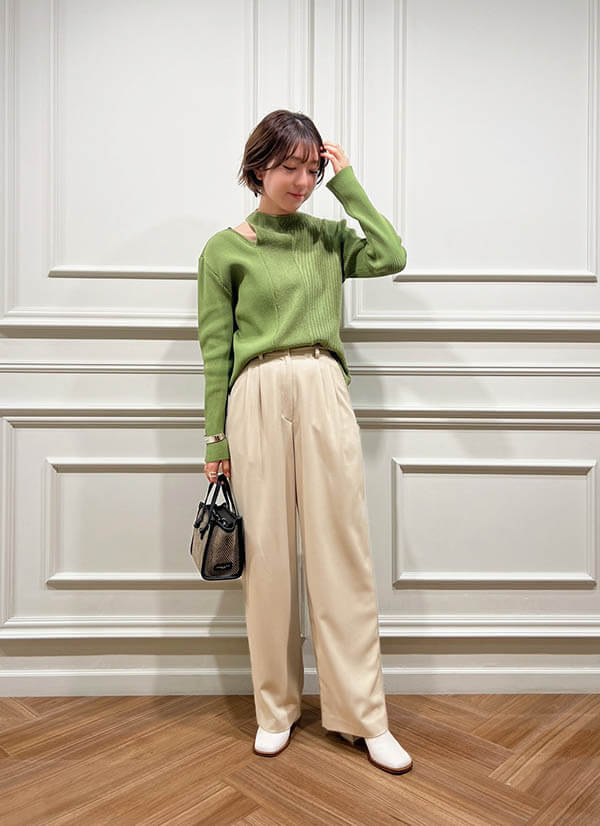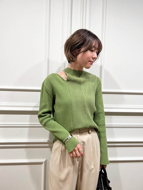鮮やかなグリーンと、アシンメトリーなデザインが素敵なAKIRANAKA(アキラナカ)のニット。