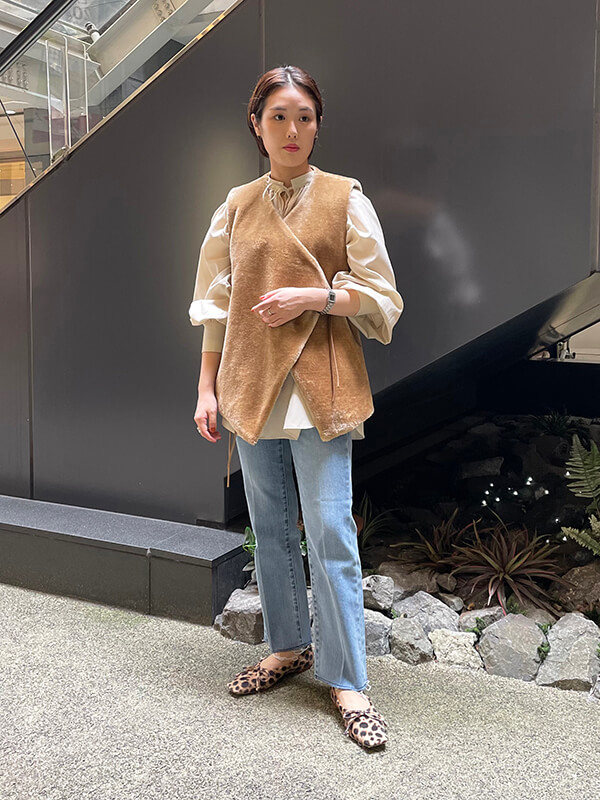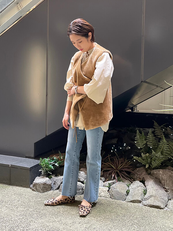 レオパード柄の小物をアクセントに大人カジュアルコーディネートに仕上げました。