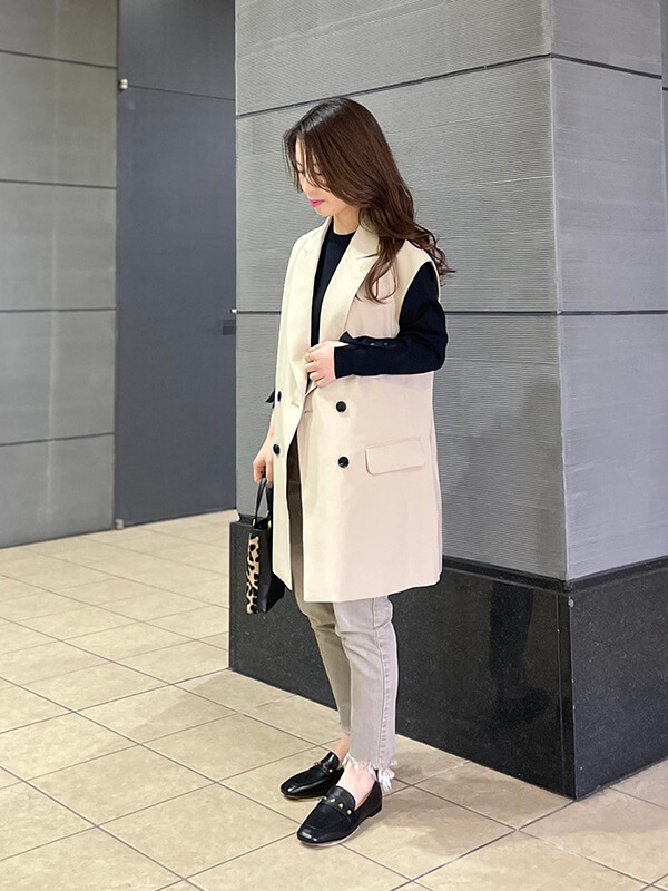 ジレできちんと感も演出しつつ、ローファーとデニムの組み合わせで程よくカジュアルな印象も持ち合わせます!