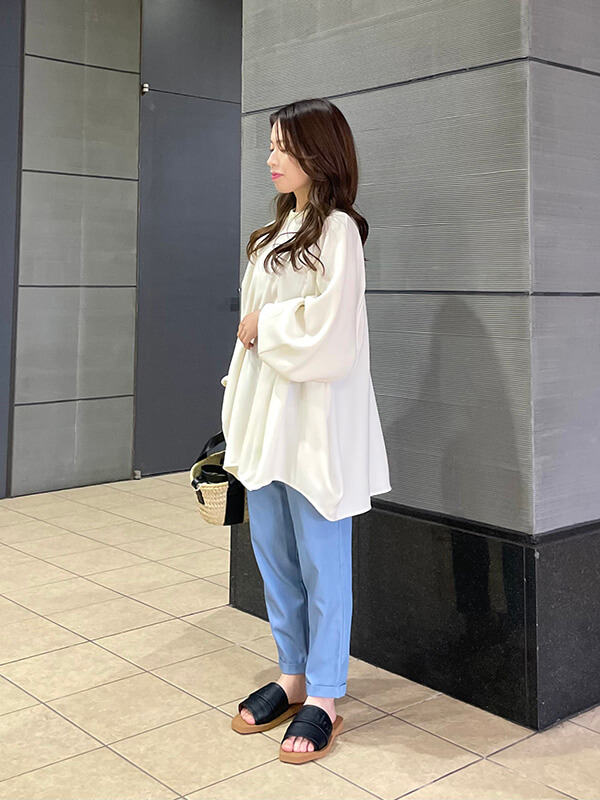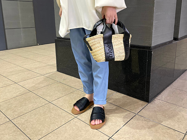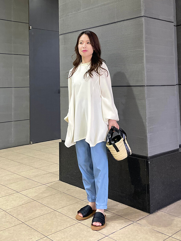 同シリーズのカゴバッグとサックスブルーのパンツを合わせて、夏らしいコーディネートに仕上げました!