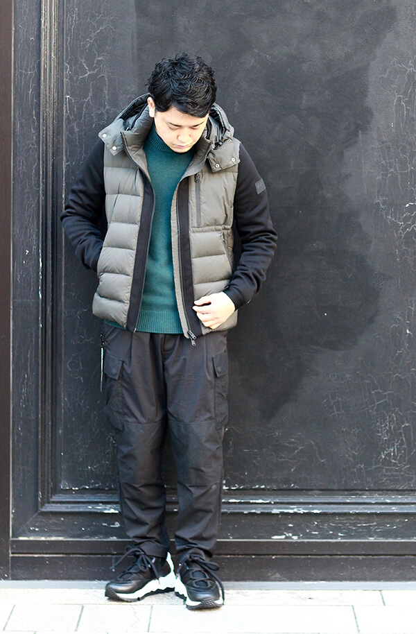 ダウンベストの実用性の高さは言うまでもないですが、こちらもフードは取り外し可能。様々なスタイルに合わせて着用できます。