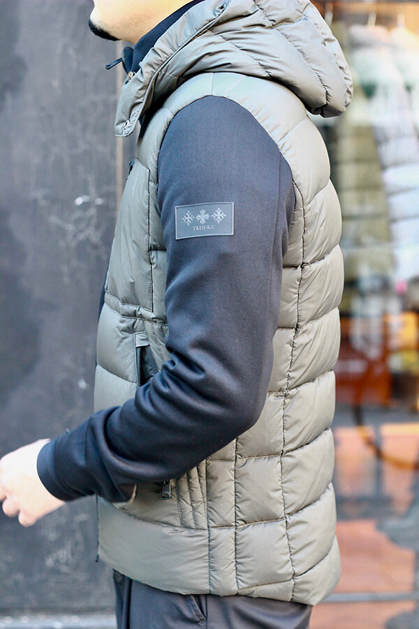 ブロックキルトのダウンパックで、ダウン特有のボリューム感を抑え、ウエストを絞ることでTATRASらしい体に沿うような細身シルエットを楽しむことが出来る一着です。