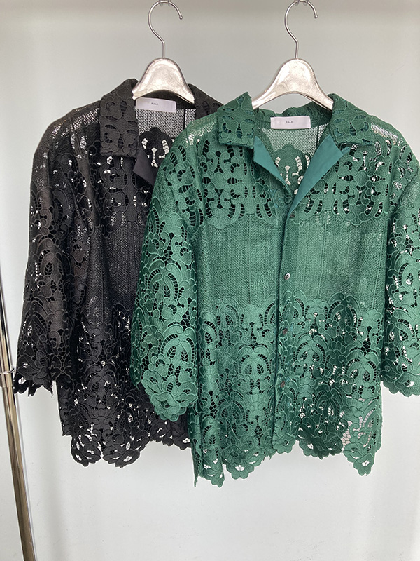 ケミカルレースを使用したシャツ。国内で染めたオリジナルのレースは、トーガらしい強さと繊細さを併せもつシャツに仕上げてあります。