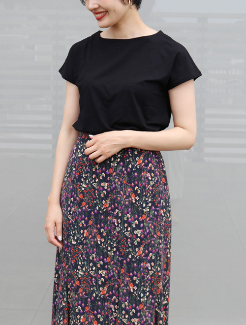 シンプルなデザインで着回し力の高いフレンチスリーブTシャツ。