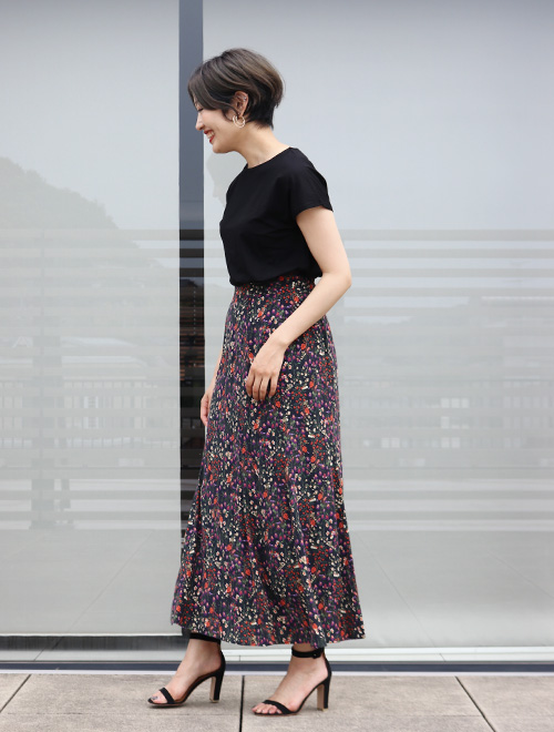 ブラックのブラウスを合わせて秋を感じるコーディネートに。