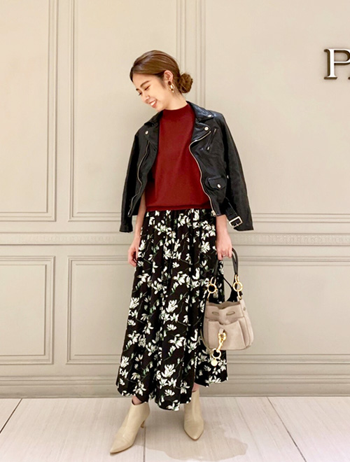 足下にパンプス、ブーツを合わせるのもオススメ、。