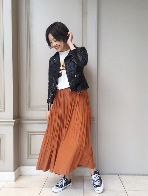 レザージャケットを羽織るだけで一気に雰囲気が変わり秋仕様に。