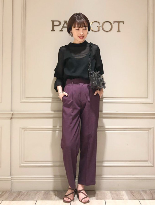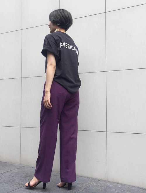 チャコールグレーは深みのあるPURPLEを合わせてモードな雰囲気とトレンド感をプラス。
