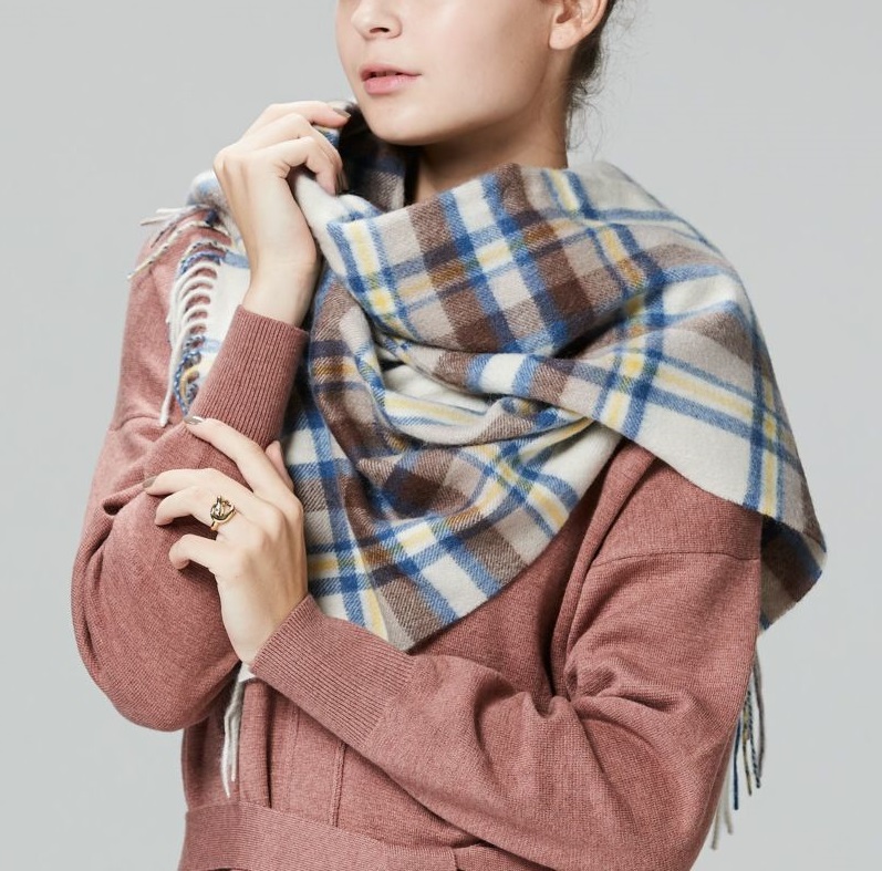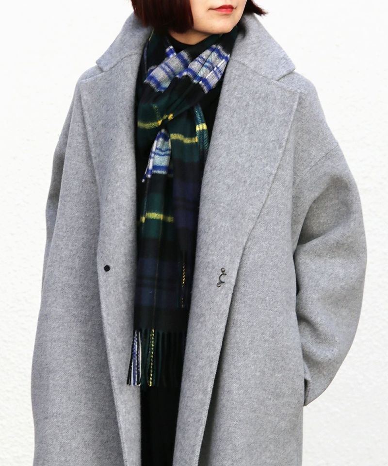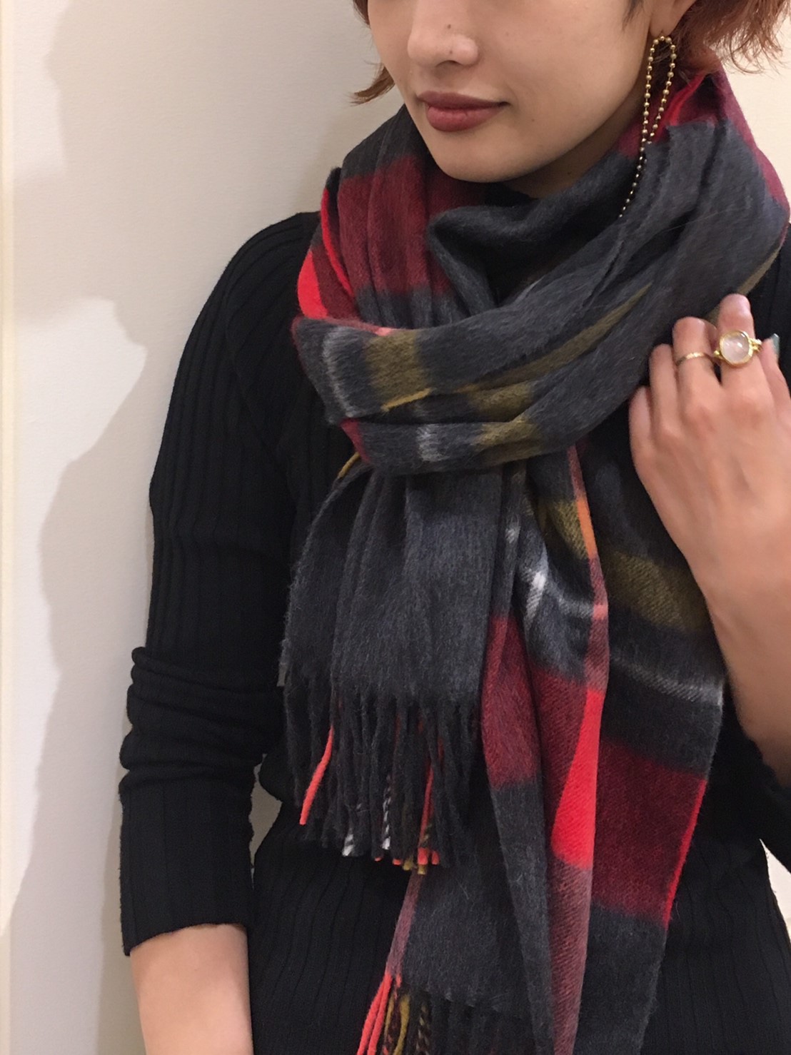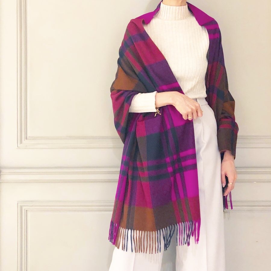 コーディネートにアクセントをプラスしてくれるチェック柄のストール。