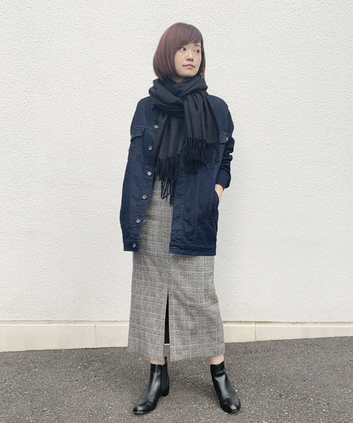 定番のデニム×チェックスカートもストールを投入するだけで違った印象に!