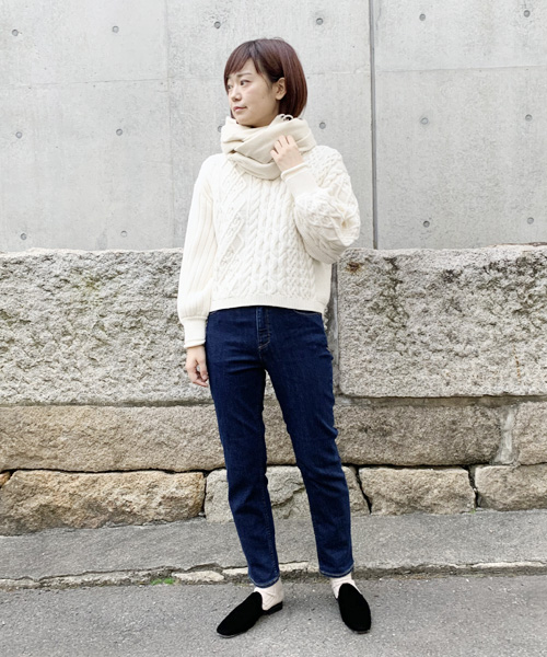 アクセントになるカラーも良いですが、ニットとストールの色を同色でまとめてあげるのもオススメ。