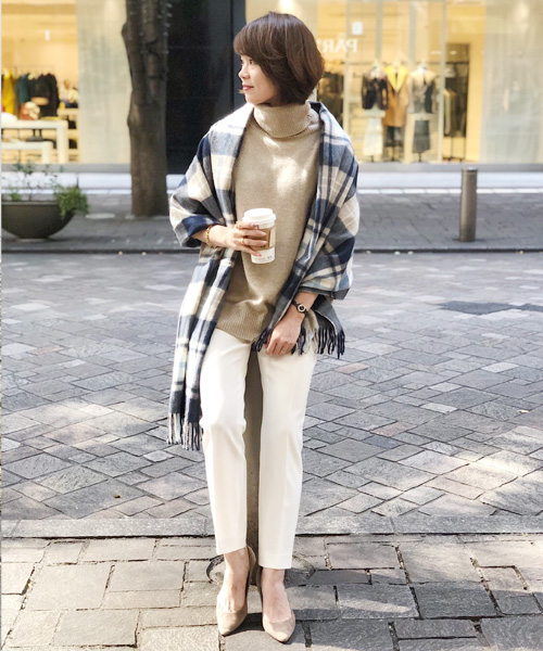 チェックのストールを左右の長さを変えて垂らすだけでコーディネートが華やかに!