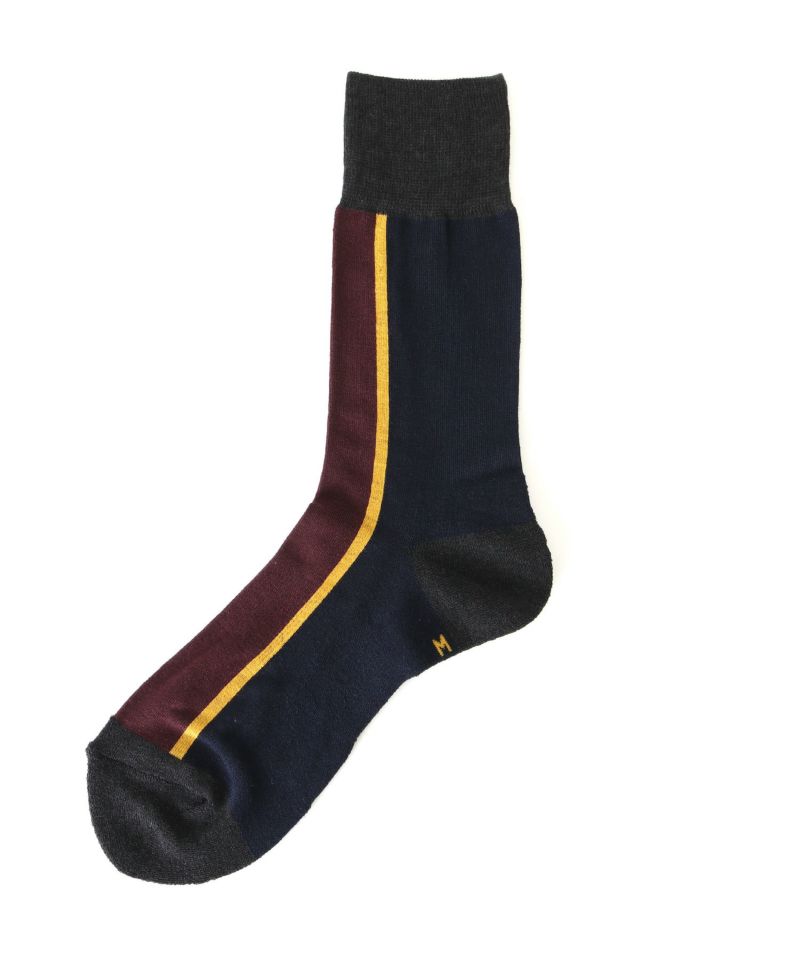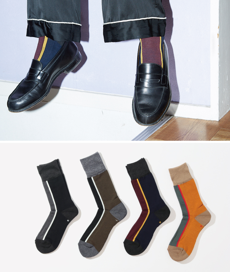 シーズンムード高まる配色がうれしい<シックストックス>の一足。上品なデザインと履き心地が特徴のソックスは、革靴でもスニーカーでもオシャレ感を演出できる優れもの。足元にアクセントを加えてロールアップを楽しみたい。