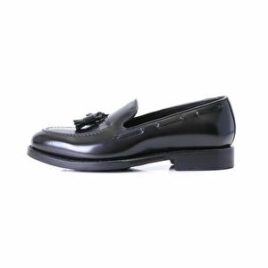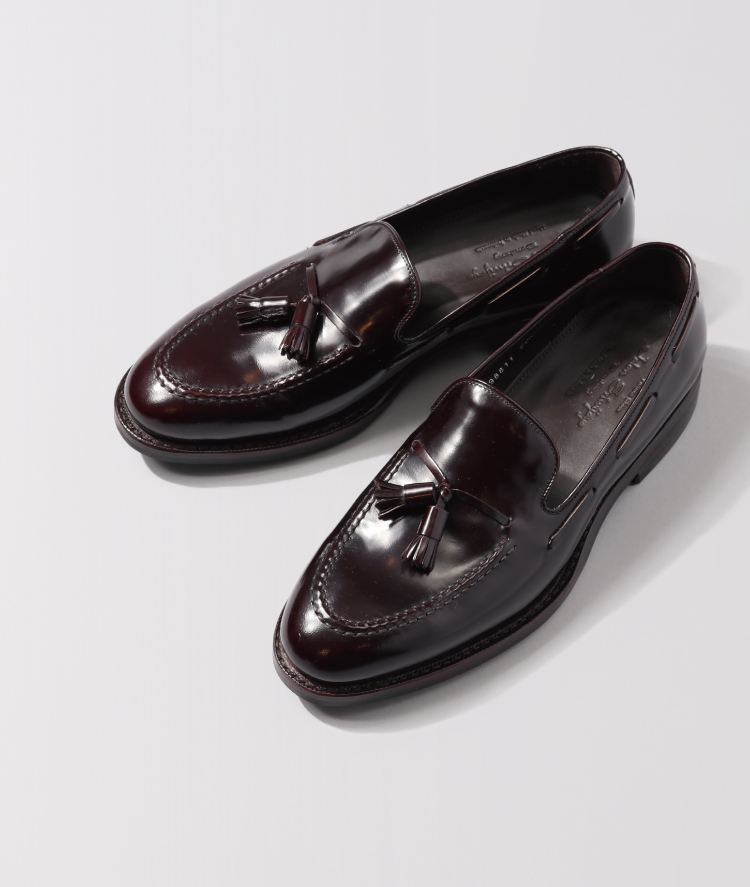 美しい光沢がエレガントさを演出してくれるガラスレザーのドレスシューズ。タッセルローファーの形はドレススタイルだけでなく、カジュアルスタイルの足元にチョイスするのも◎。
