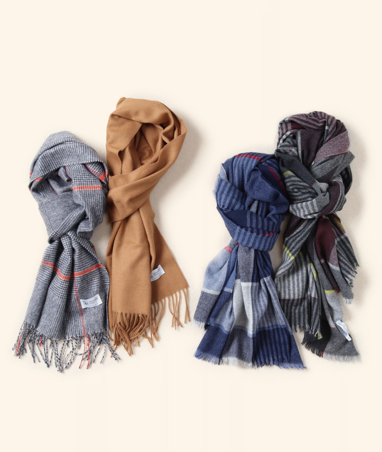 肌触り抜群の100%カシミヤを使用した上質なストール。定番の無地やリバーシブルタイプなどバリエーションも豊富にそろえています。