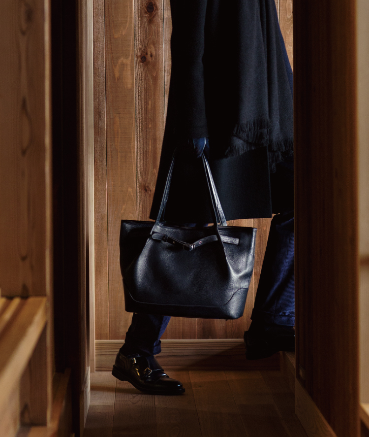オリジナルレシピで開発されたシュリンクレザーを使用したレザートートバッグ。ベルトデザインが程よいアクセントとなっています。オンオフで兼用できるバランスの良いサイズ感も◎。
