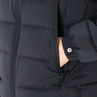 マットな光沢がスポーティな印象のポリエステル素材。ダウン専業ブランドならではのタフな顔つきが、タウンユースはもちろんアウトドアシーンでも活躍してくれます。
