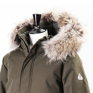 ピレネックスのフードに縁取られたファーは、フィンラクーンの毛を使用して作られています。