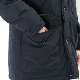 ADHOCのダウンは大き目のボタンが特徴。デザイン性もさることながら、手袋などをはめたてやかじかんだ手でも着脱しやすくなっています。