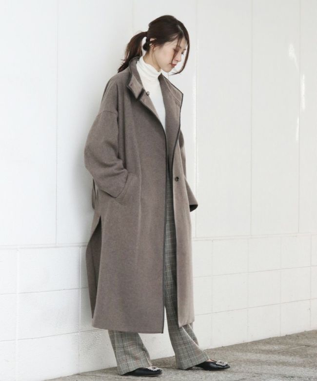 エコレザーパイピングがアクセントになったスタンドカラーコート。
