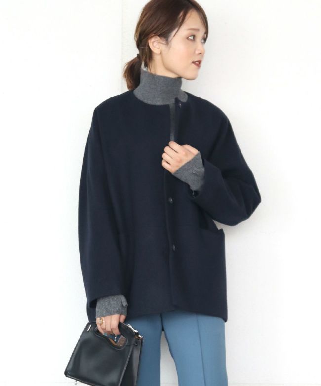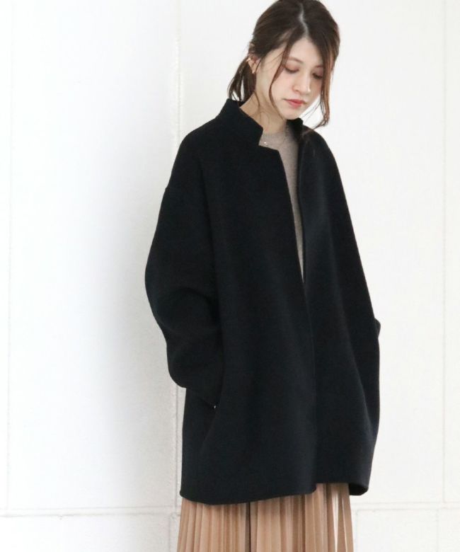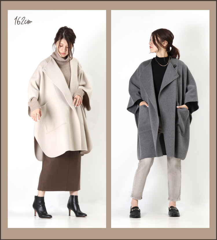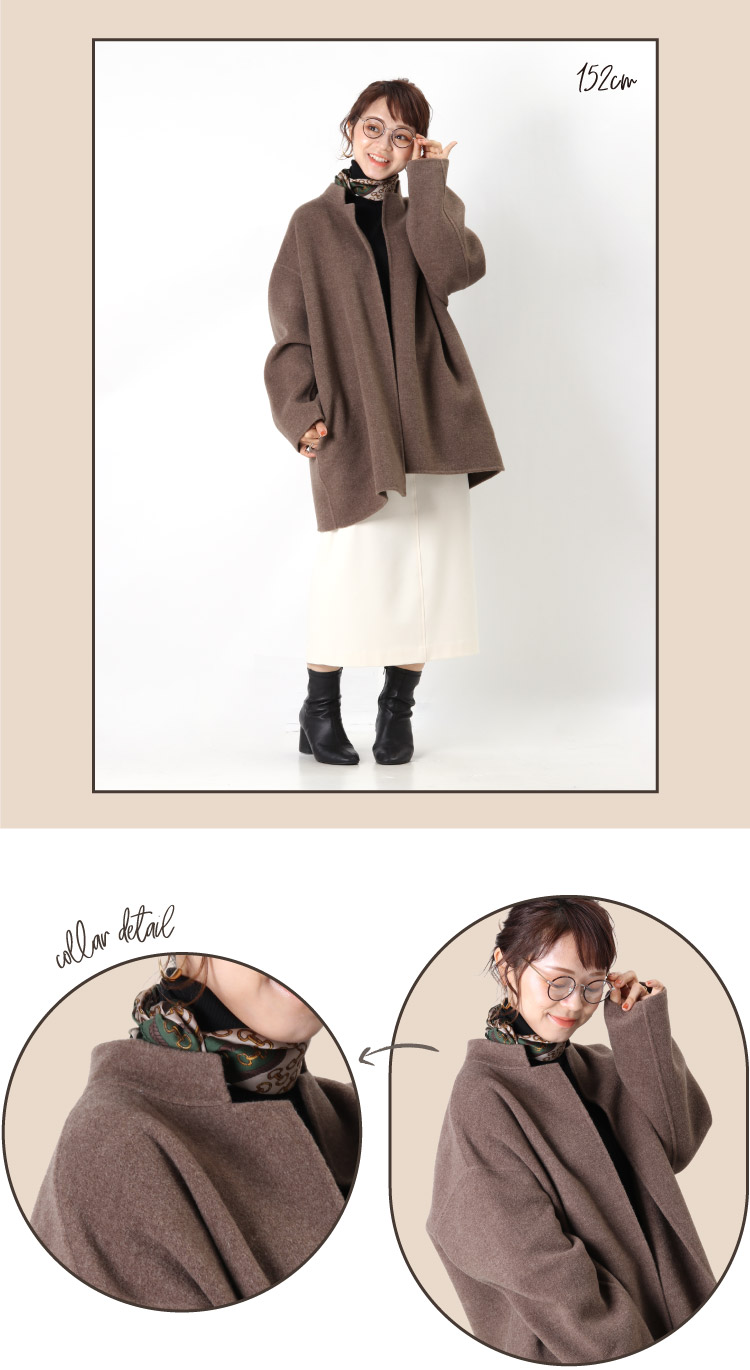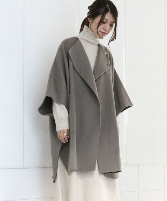 【デザイン】 上質な「ロイヤルジーロンスーパー140」素材を使用したノーカラーポンチョコート。ストレスフリーなシルエットでボリュームトップスとも好相性。早い時期から真冬まで長く着ていただけます。