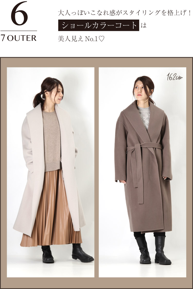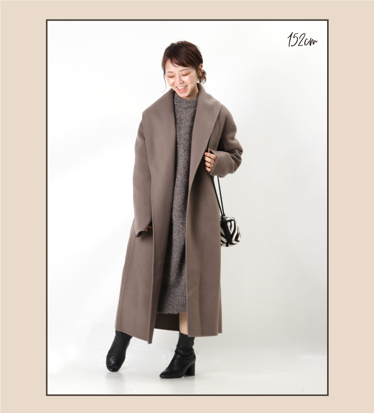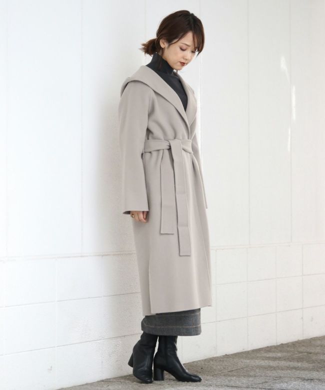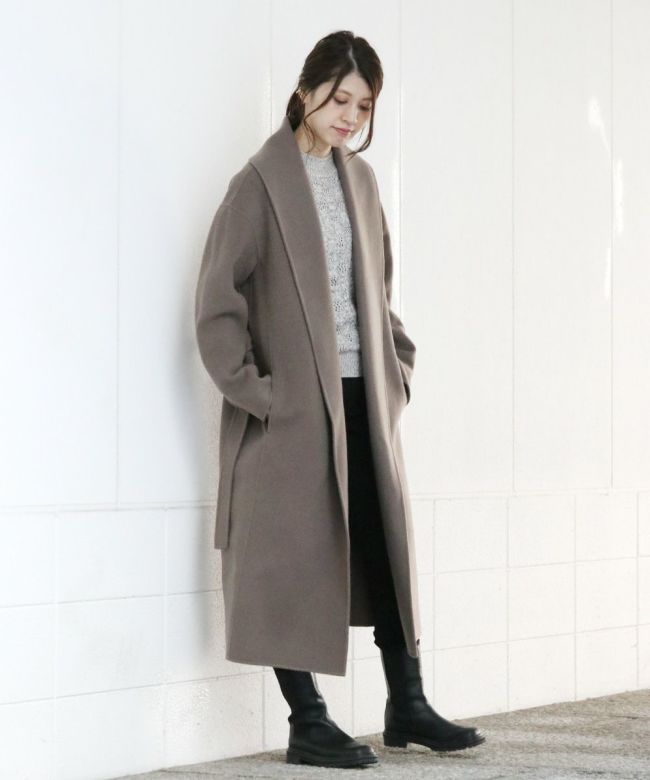 【デザイン】 大人っぽいこなれ感が漂うショールカラーコート。 ITALY FAbRICA社のスペシャルな紡毛素材を使用。柔らかな風合いと品のある生地感が、高級感を演出。冬に人気のあるモカ、グレージュのニュアンスカラー2色をご用意。