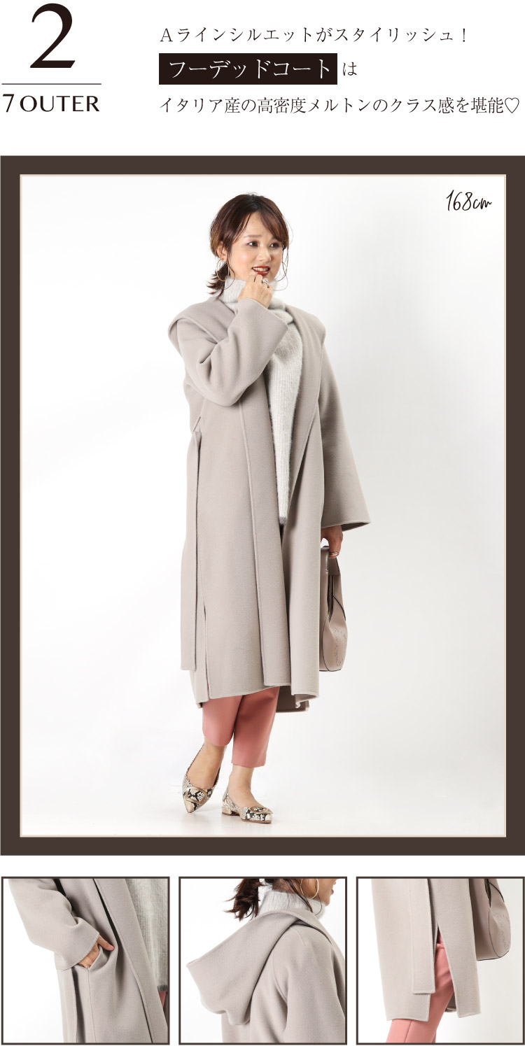 【デザイン】 大人のためのフードコート。前身頃からフードにかけて、接ぎ目を入れずに繋げたラインが大人っぽく上品。ロング丈ですがサイドにスリットが入っているので重たさを感じさせません。イタリアPRATO産地にあるMENCHI社にて開発したリッチなメルトン素材。