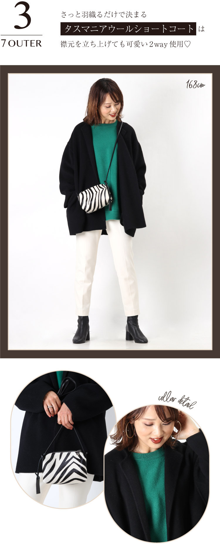 【デザイン】 テーラードの襟を立ち上げたようなデザインがポイントになったショートコート。程良いラフさが大人っぽい。「タスマニアエアリービー」という希少価値の高いエレガントな素材を使用。