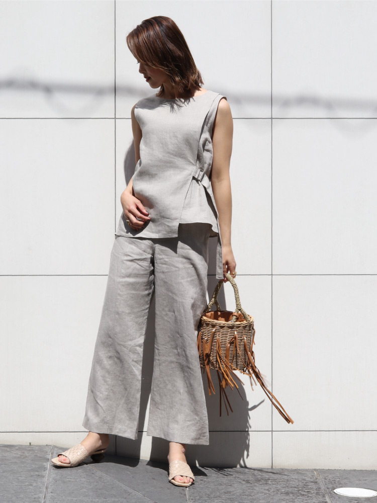 清涼感のあるリネンならハンサムなデザインも切れ味よく。アシンメトリーデザインで、1着でマニッシュに決まるデザインだからこそ、シンプルなスタイリングでも簡単美人見え。