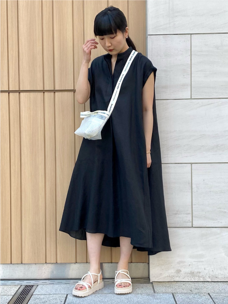 女っぽいブラックワンピースも白のきれいめスポサンで新鮮な雰囲気に。軽やかなクリアバッグを合わせて、心地よく自然体な大人レディスタイルを満喫して。余計な色を使わない潔さが、初夏にぴったりの清涼感を醸し出してくれます。