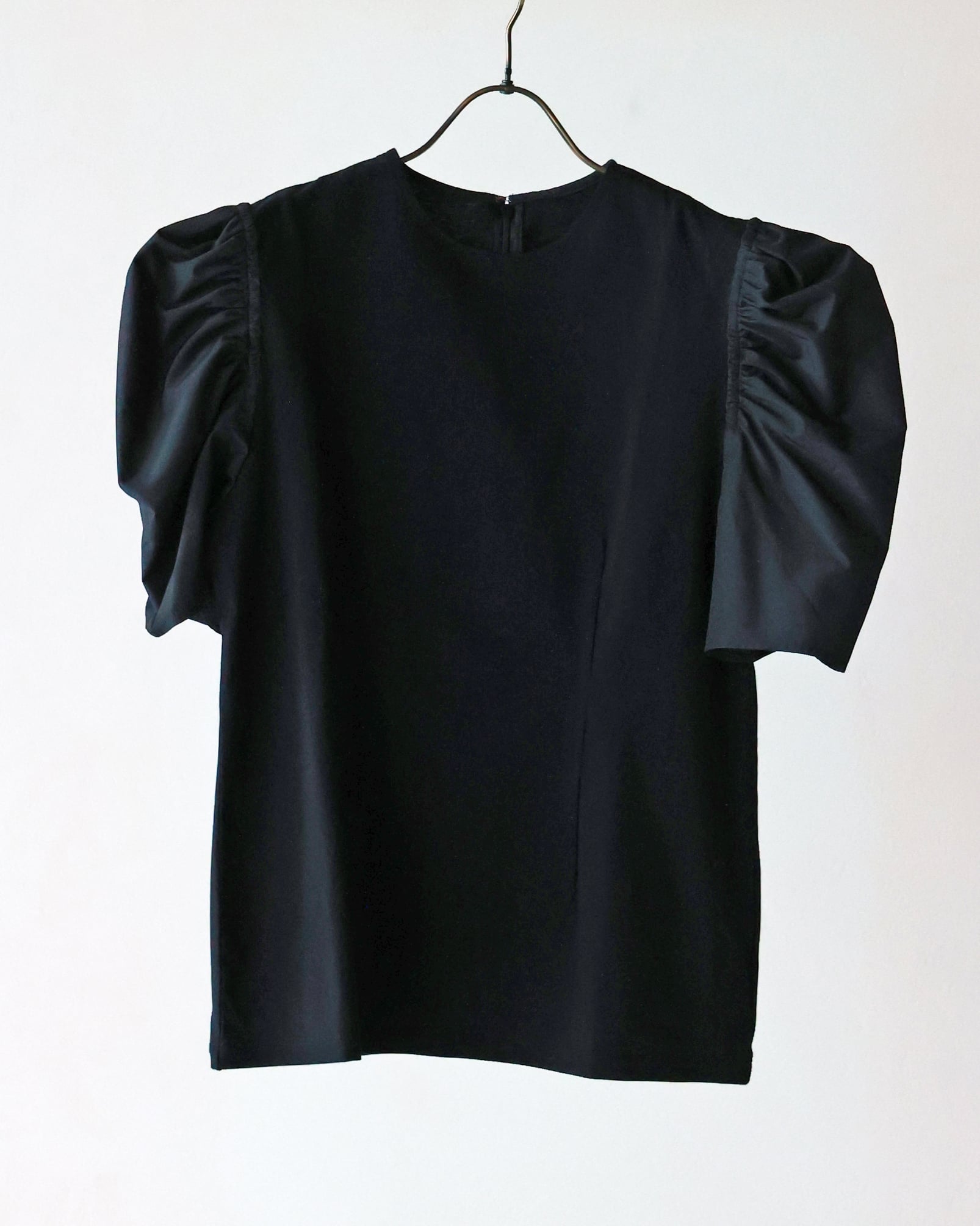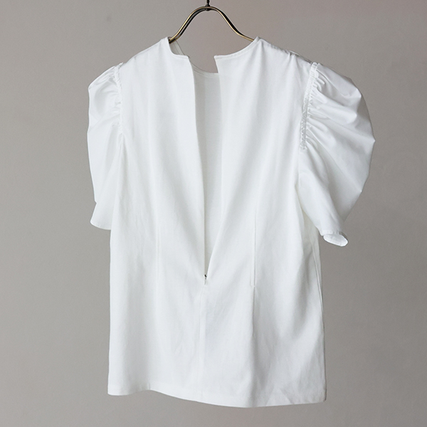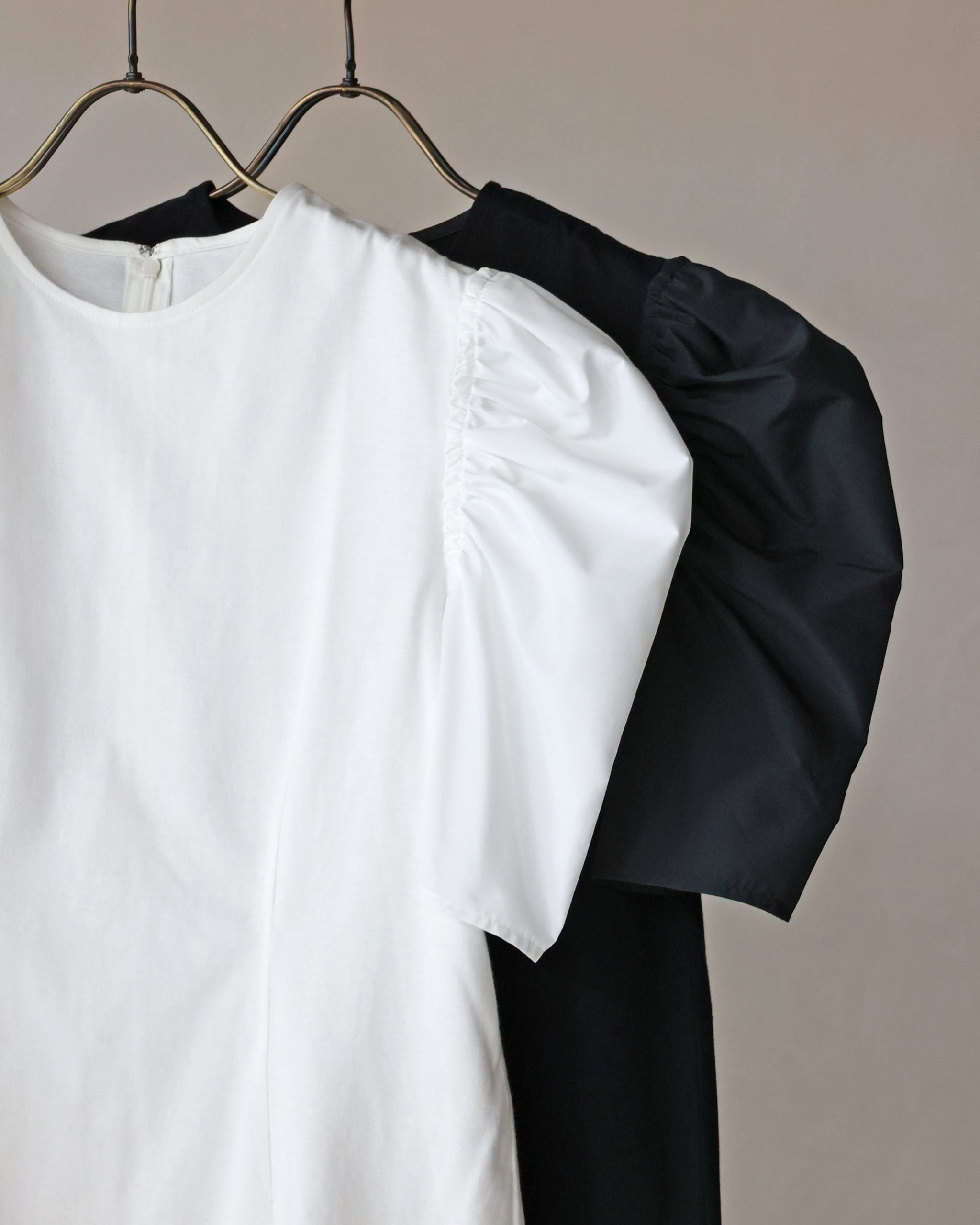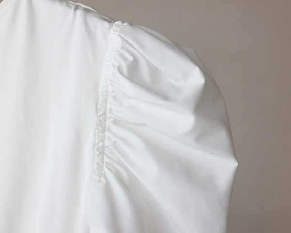 特徴的なパフスリーブ部分は、ポリエステル素材で切り返すことでさりげない光沢感を実現。