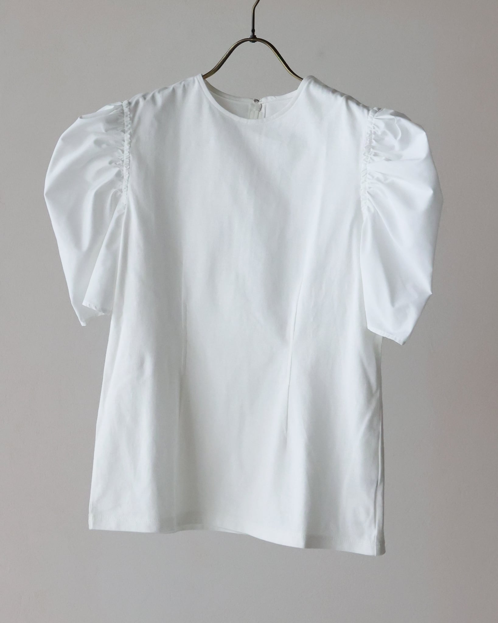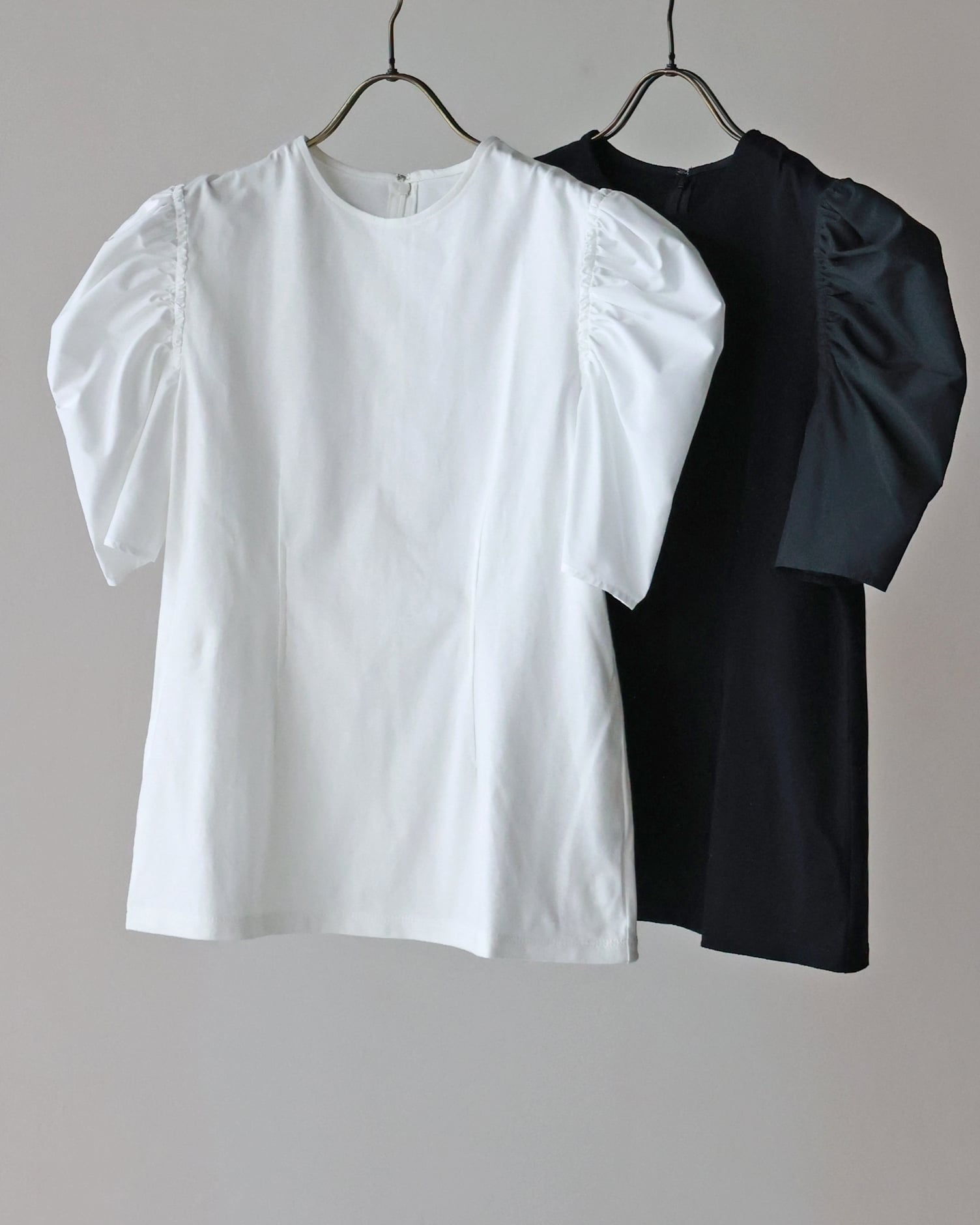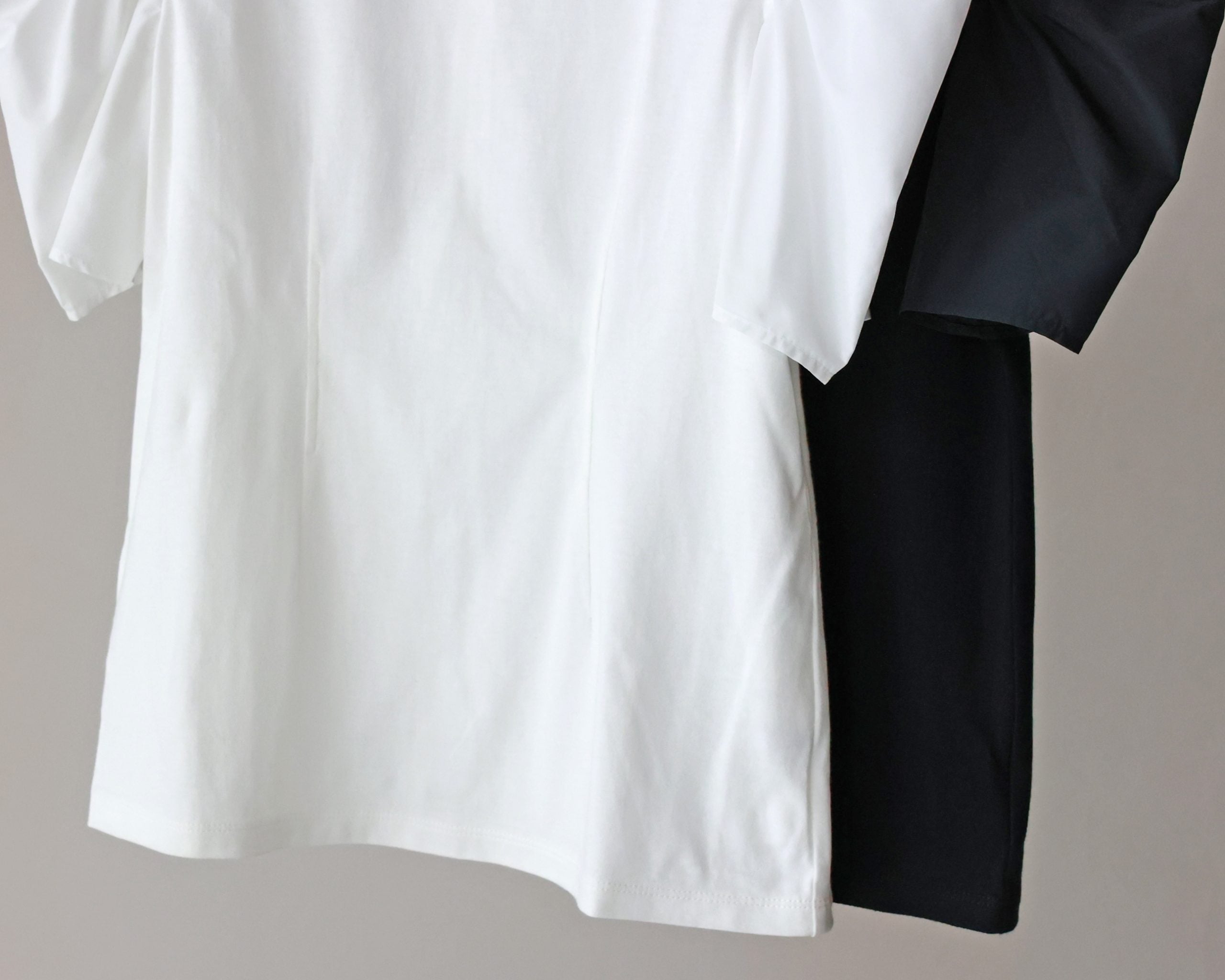 特徴的なパフスリーブ部分は、ポリエステル素材で切り返すことでさりげない光沢感を実現。