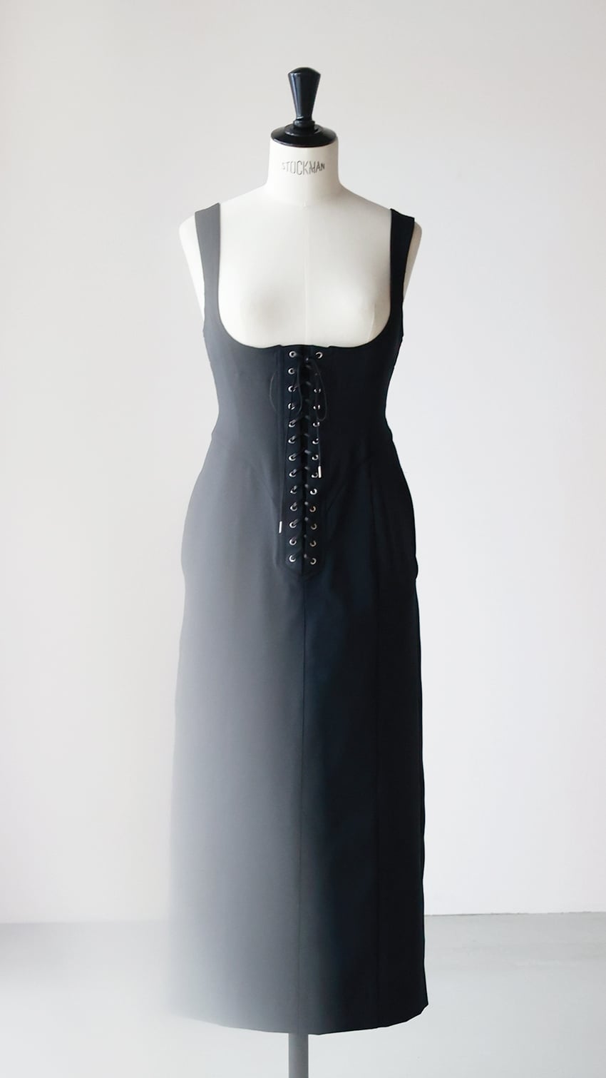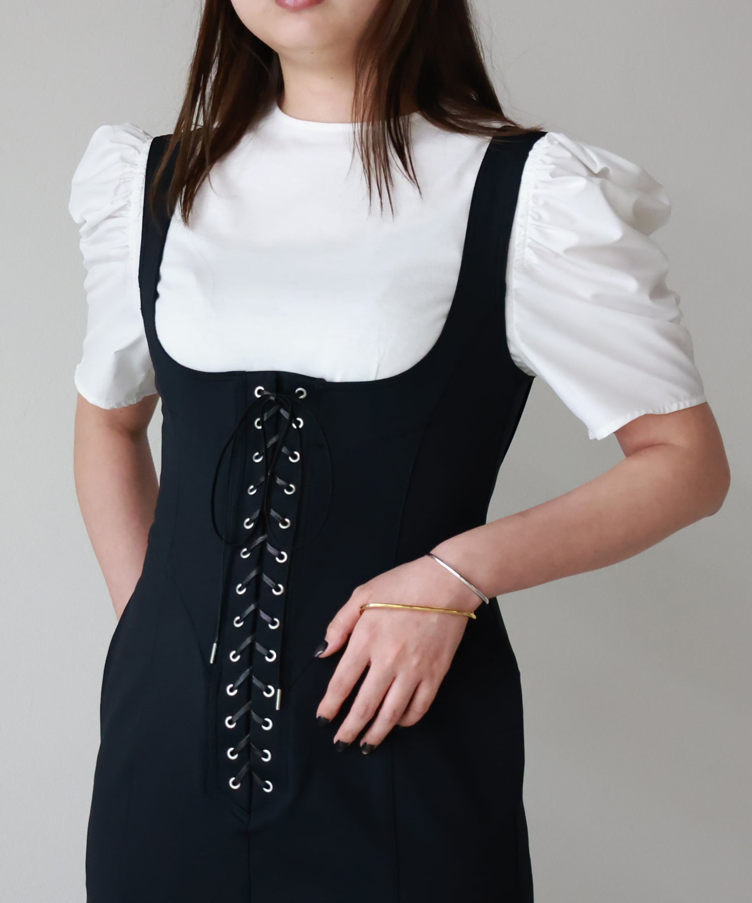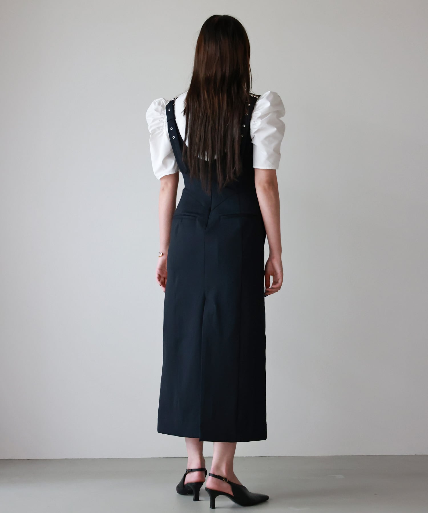 今回のアイテムは、ウエストのレースアップが印象的なジャンバースカート。
