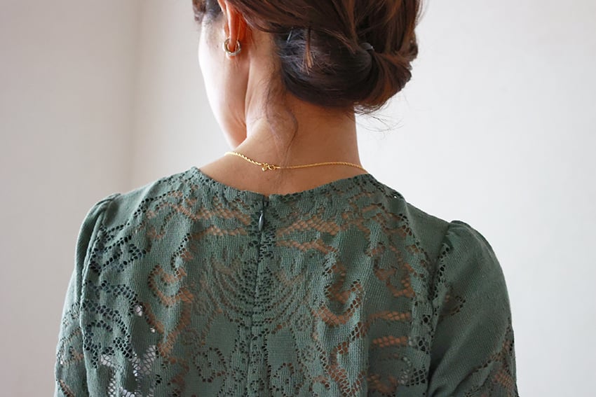 袖はさりげないパフスリーブ。そして、ややタイトなシルエット。