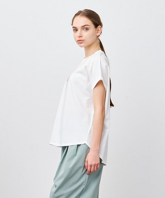 一枚で着映えするタックディテールのデザインカットソー。ハーフスリーブで肩にはタックディテールを施した気の利いたデザイン性のあるアイテム。ボトムスを選ばず、今から夏までロングシーズンで使えるトップスです。