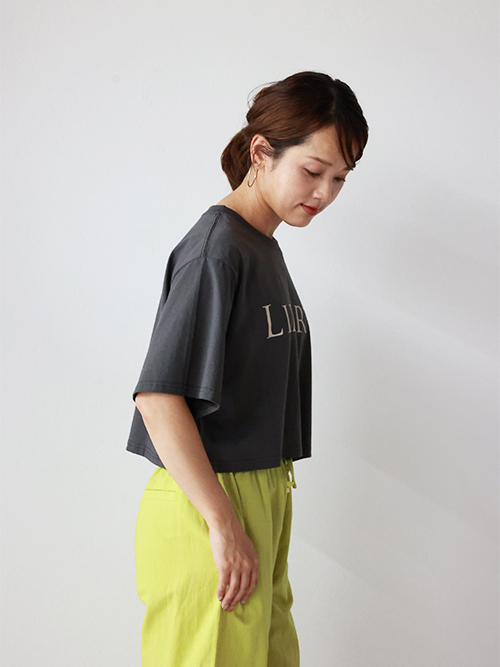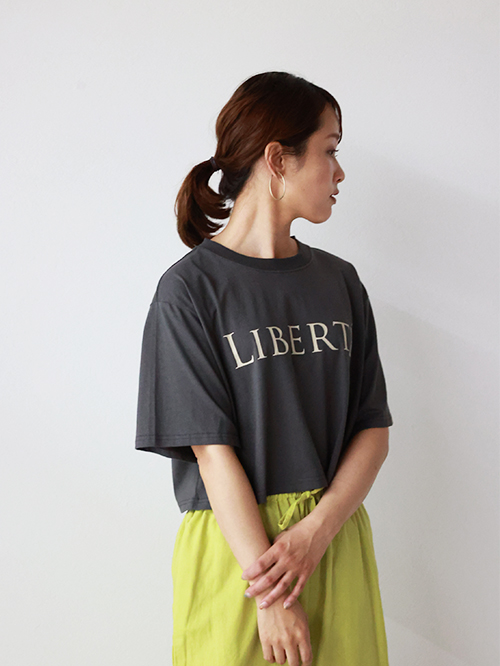 リラクシーな袖や身頃に、ショート丈でトレンド感をプラスしたカットソー。様々なボトムとコーディネートしやすく、デイリーに活躍するアイテムです。「LIBERTE」は自由を意味し、ロゴの字体は細めですっきりとしているので、大人の方も抵抗なく着ていただけます。