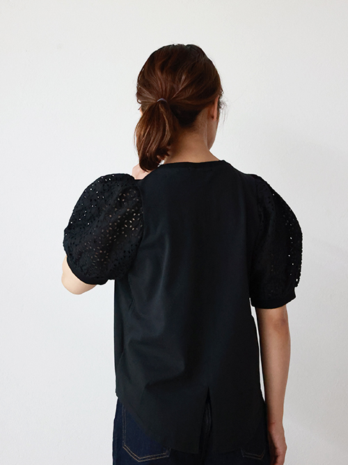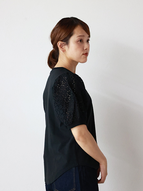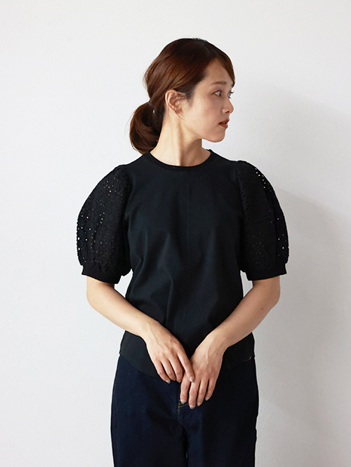ボリューミーなレース袖がポイントになったカットソー。袖のレース部分は透けにくく、甘すぎず繊細すぎないデザインに仕上がられています。カットソー素材なので着やすく、ブラウス代わりにキレイめに着用していただけます。