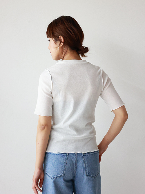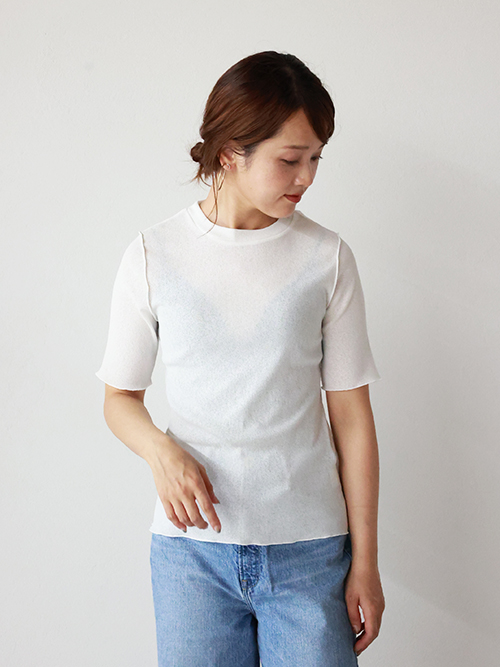 ほのかなシアー感とシボ感のある豊かな表情が特徴のカットソー。 普通のTシャツとは異なる表情のある生地感が魅力。ほのかなシアー感もカジュアル過ぎずに決まります。
