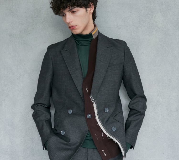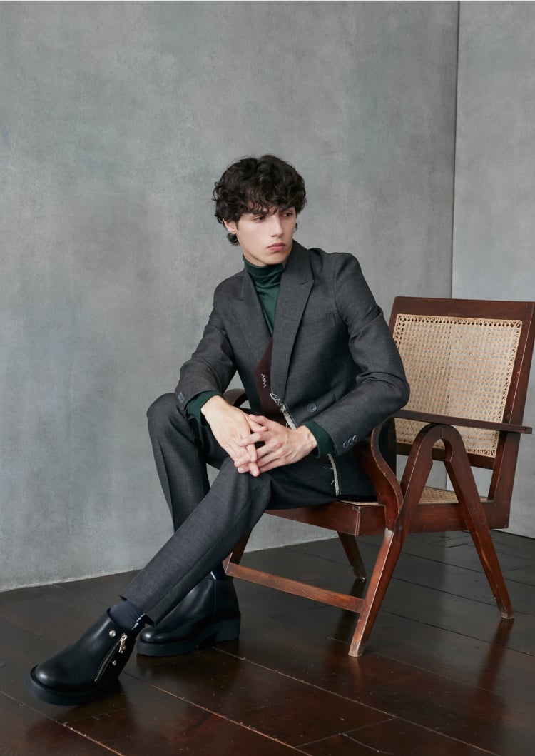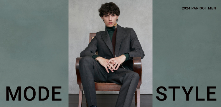 エレガントさにデザイン性を融合させたモードなセットアップスタイル。ファブリックは上質なシェットランドトロピカルウールを使用し、トラッドな表情が特徴。