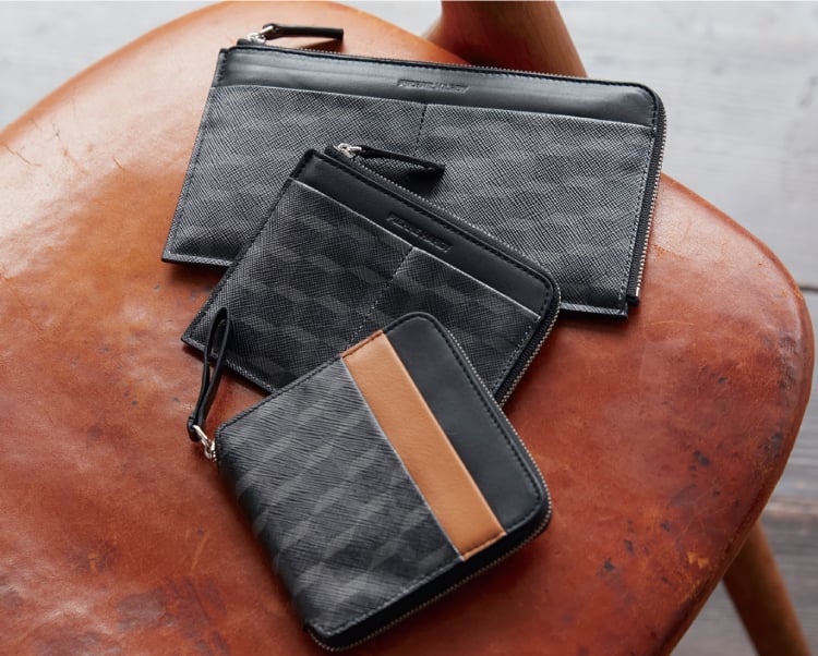 ブランドアイコンとなる幾何学柄が特徴の“CUBE BOX”シリーズ。現代のライフスタイルに合わせたコンパクトなレザーグッズはどれも収納に優れた必需品。