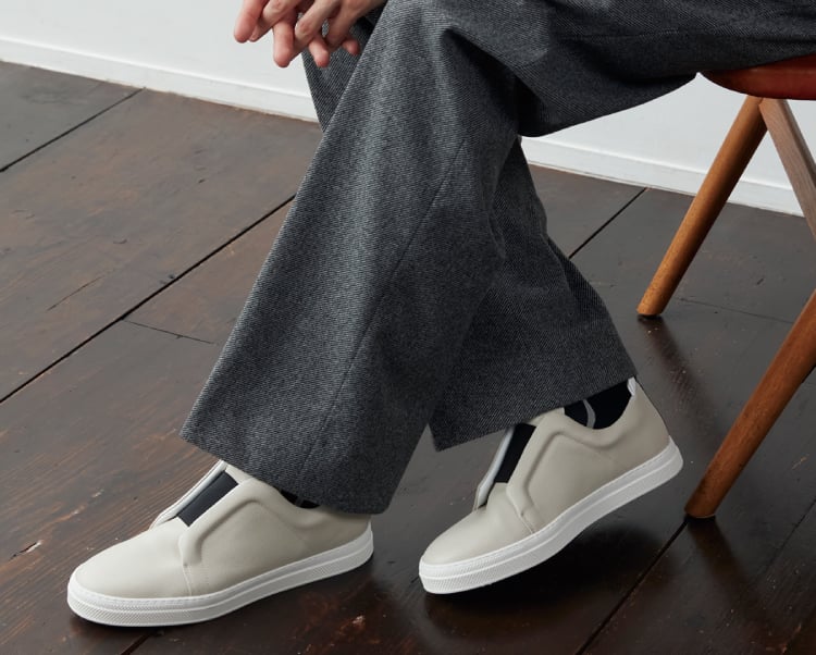 人気の“スライダー”スニーカーに、グレインカーフレザーが新登場。表面に表情を持たせた顔つきで、足元にアクセントを加えられる。