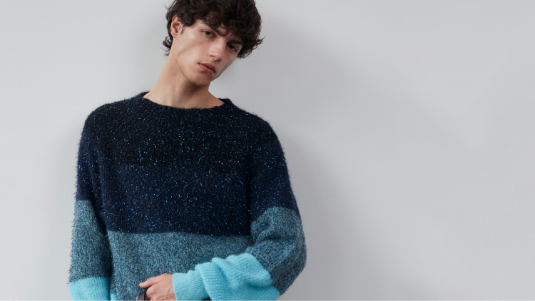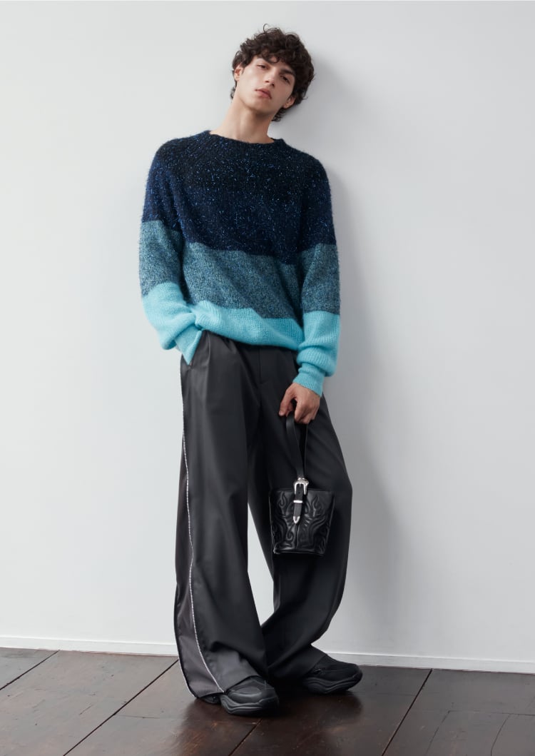 同色系のグラデーションニットは、ラメ素材を使用した華やかな1枚。ジップワークを配し、シルエットの変化が可能なパンツを合わせてモードな装いに。