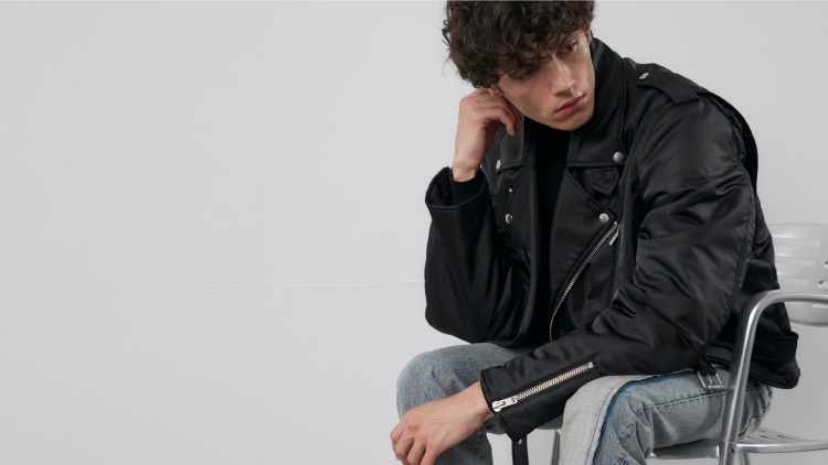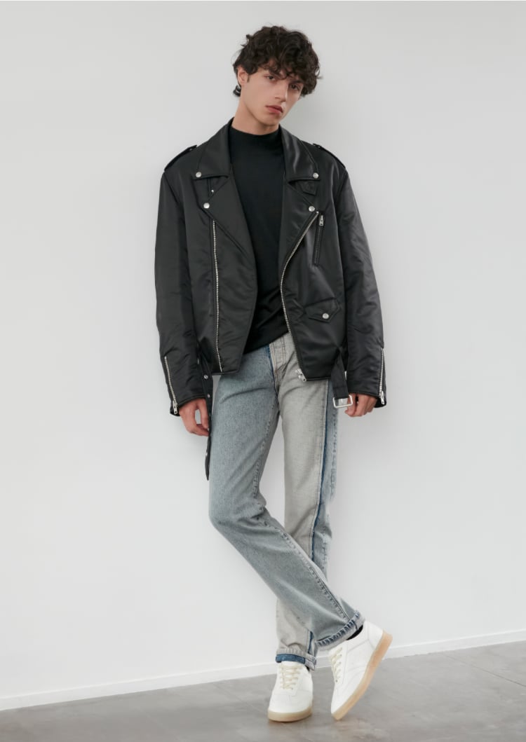 ワイドなノッチドラペルとベルト&ボタン付きの フラップポケットがデザインされたバイカージャケットは、レザーではなくポリエステルにすることでスポーティな印象に。再構築されたストレートデニムを合わせたモダン&ヴィンテージスタイル。