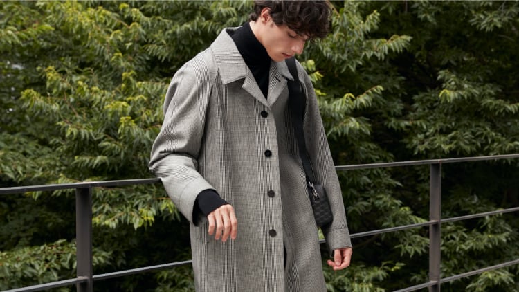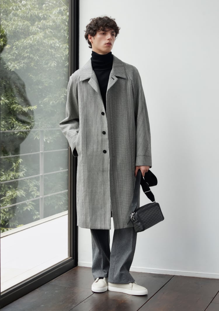 抜群なパターンと縫製が際立つ、千鳥×ランダムストライプが上品なステンカラーコート。小物をアクセントに加えた大人のオンとオフを昇華させるスタイリング。
