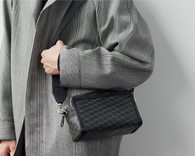 ミニマルなフォルムでありながら、洗練された柄と大ぶりなベルトのバランスがマッチしたショルダーバッグ。ビジネスからトラベルなど、幅広く愛用できる実用性も兼ね備えたアイテム。