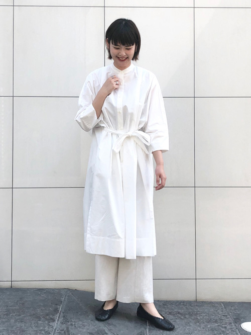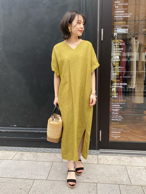 ゆったりとしたシルエットで、リラックス感たっぷりのロングワンピース。後ろのウエスト部分につまみデザインをあしらうことで、後姿にアクセントをプラス。首元は、程よい深さのVネック、後は抜け感のある襟あきで、女性らしさを演出してくれます。1枚で着用するのはもちろん、ボトムスをレイヤードするスタイリングもオススメ。
