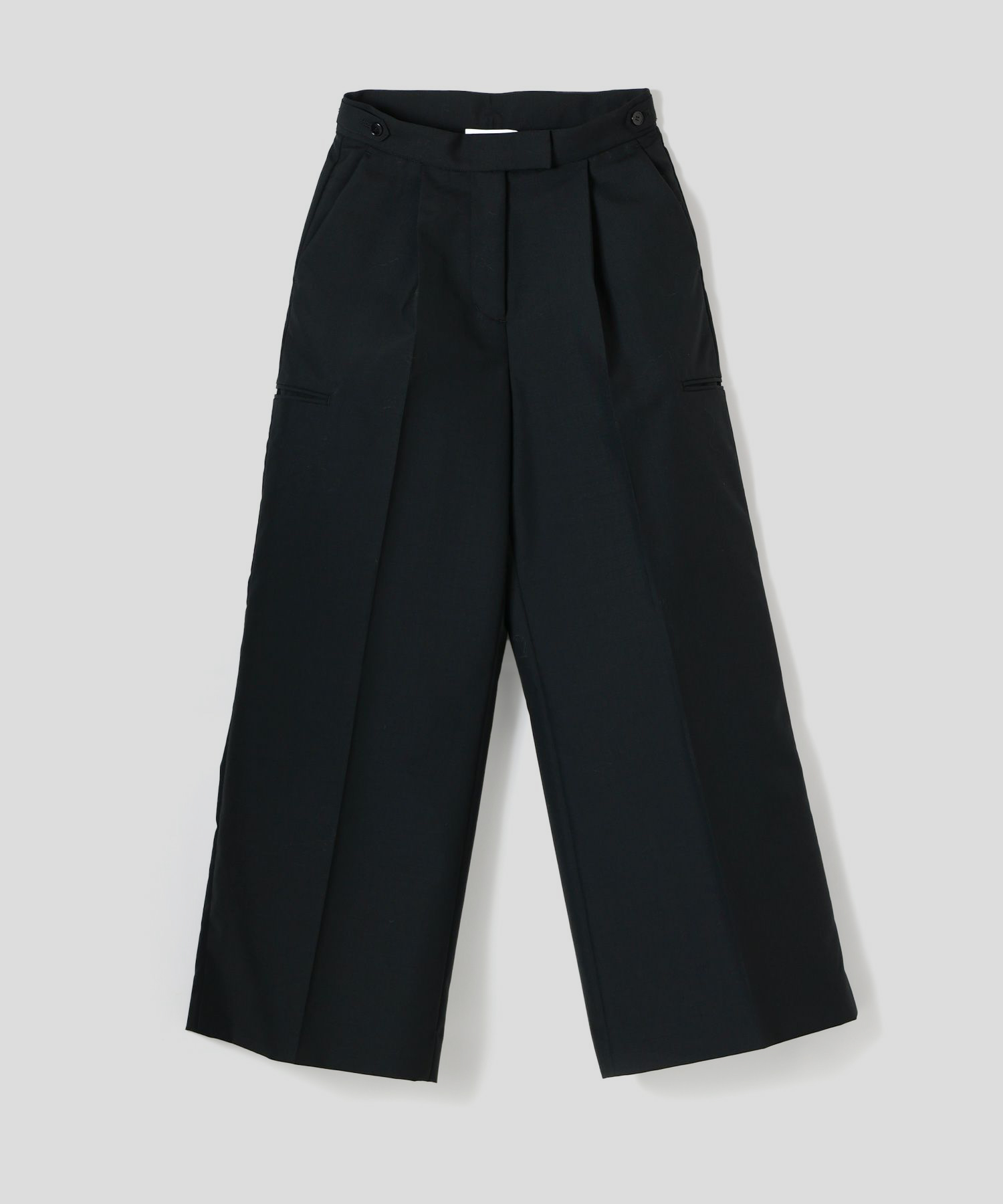 テーラードジャケットのエッセンスを落とし込んだワイドパンツとなっており、マニッシュなデザインが際立つ一本に仕上がっています。