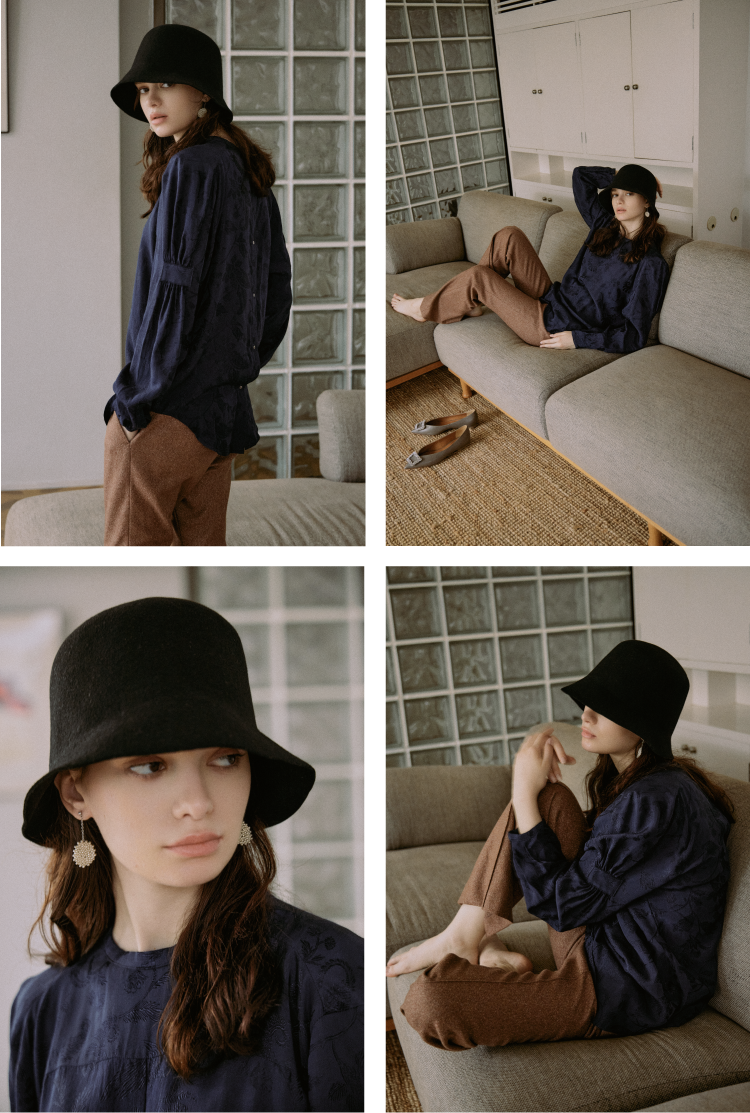 袖にギャザーとパッチをあしらったブラウス”MONROE”も、パリゴ限定のオリジナルカラー・NAVYで作成しております。ペイズリーパターンはヘリテージの意味合いも去ることながら、ネクタイなどにも使用される中性的なイメージのモチーフとして採用。シーズンテーマである性を曖昧なものにしたいという想いを込めたオリジナルの素材として、今シーズンを象徴する一つです。